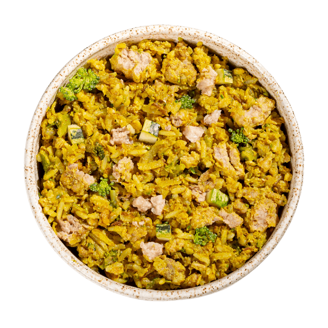 Pernil suíno, fígado, arroz branco, batata doce, abobrinha, brócolis, aveia, farinha de linhaça, óleo de girassol, óleo de coco, cúrcuma, suplementos para cães Food Dog Sênior e Food Dog Fit Fibras.